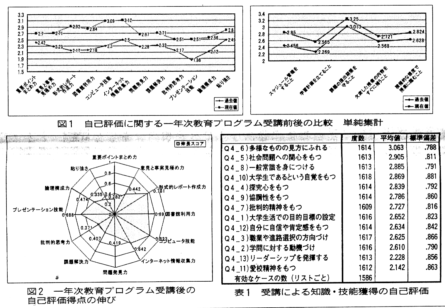 次に受講による知識・技能獲得の自己評価は表1に示されているとおりである。「多様な視野の獲得」、「社会問題への関心」「一般常識」が評価の高い項目であり、評価の低い項目としては、「リーダーシップ」と「愛校精神の醸成」が挙げられる。