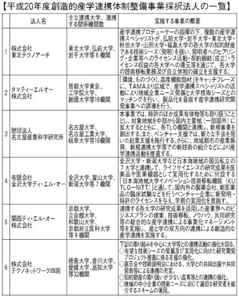 経済産業省はこのほど、地域における産学連携のモデルとなることが期待される取組みを実施する六法人を、平成二十年度「創造的産学連携体制整備事業」として採択した。(下の表)